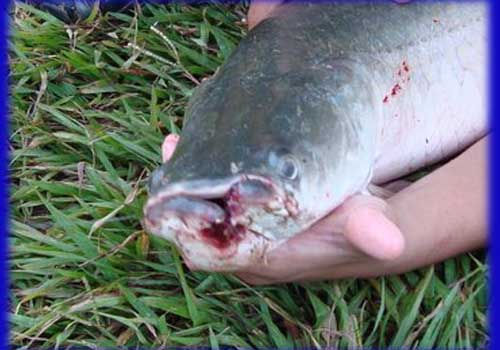 Normalmente as carpas húngaras e espelhos ficam com a boca rasgada e pendurada depois do uso do alicate, pois elas não sustentam o peso de seu corpo penduradas pela boca. Assim sua mandíbula é dilacerada, rasgada e o peixe cai no chão.