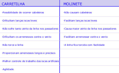 Veja no quadro a seguir as vantagens e desvantagens entre a carretilha e o molinete.