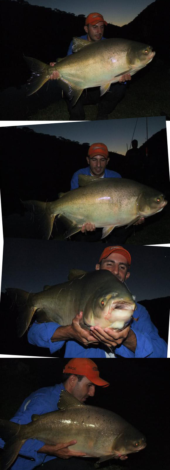 As 13:00h paramos para um maravilhoso almoço com nossos amigos cariocas e depois de um longo bate-papo retornamos ao lago, arremessei então uma bóia torpedo com um chicote de 1,5mts, uma boinha para regular a altura e como isca a tripa, deixei esta a 30cm de profundidade, cerca de 15 minutos depois peguei a vara para recolher e fazer um novo arremesso, e percebi que a linha estava muito solta, comecei a recolher e quando percebi a linha começou a esticar, levantei a cabeça e não vi a bóia, ou seja, tinha peixe no anzol, fisguei e tomei uma grande puxada de linha, mas mantive o controle e rapidamente trouxe o peixe até bem perto da margem. Mas bastou o peixe levantar o grande rabo, grande mesmo, dar uma rebojada e voltar para o meio do lago. Neste momento percebemos que era um grande exemplar amarelão com o rabo preto.