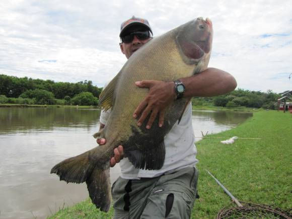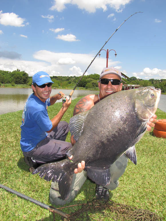 Em busca dos pintados, o Júnior deixou uma grande posta de tilápia armada no fundo a uns 5 metros da margem e quando menos esperávamos, uma barulho alto de fricção fez a varinha deitar e o peixe levou no mínimo uns 60 metros de linha da carretilha Abu com multifilamento. Saí correndo, tive dificuldades para tirar a vara do suporte, travei e trouxe para o Júnior acabar com a briga. Depois de muito, mas muito tempo um gigantesco Tambacu encostou na margem para nos dar boas vindas, mas rebojando e voltando para o meio do lago, isso ocorreu diversas vezes até que cansado, o peixe se entregou.