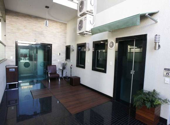 A área comum além da recepção tem grandes salas, além da área para Internet.