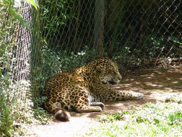 A onça-pintada (Panthera onca) é o maior felino das Américas; seu corpo é robusto e musculoso, seu tamanho varia entre 1.120 – 1.850 mm (cabeça e corpo) e altura entre 450 – 750 mm, sua cauda tem cerca de 57,5 cm e o peso varia entre 60 – 90 kg. A onça pintada possui uma coloração que vai do amarelo bem claro a amarelo acastanhado, seu corpo é revestido por pintas negras que podem formar rosetas grandes, médias ou pequenas. Ela é atualmente encontrada das planícies costeiras do México até o norte da Argentina. Habita áreas de vegetação densa, abundância de água e alimentação; áreas tropicais e subtropicais, cerrado, caatinga e pantanal.