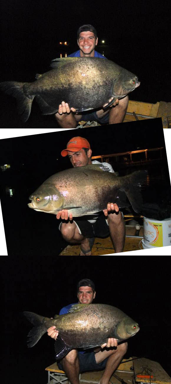 Mesmo depois de anoitecer, continuamos a cevar e na sequencia arremessávamos as salsichas na ceva. Fisgamos mais três exemplares de tambas e perdemos outros dois.