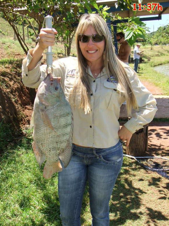 A pescadora Roberta Lara acompanhada de seu namorado e que reside na cidade de Belo Horizonte e frequenta constantemente a Fazenda Kiki dedicou-se basicamente na pescaria das grandes Tilápias do local e capturou uma grande quantidade e registramos um dos exemplares.
