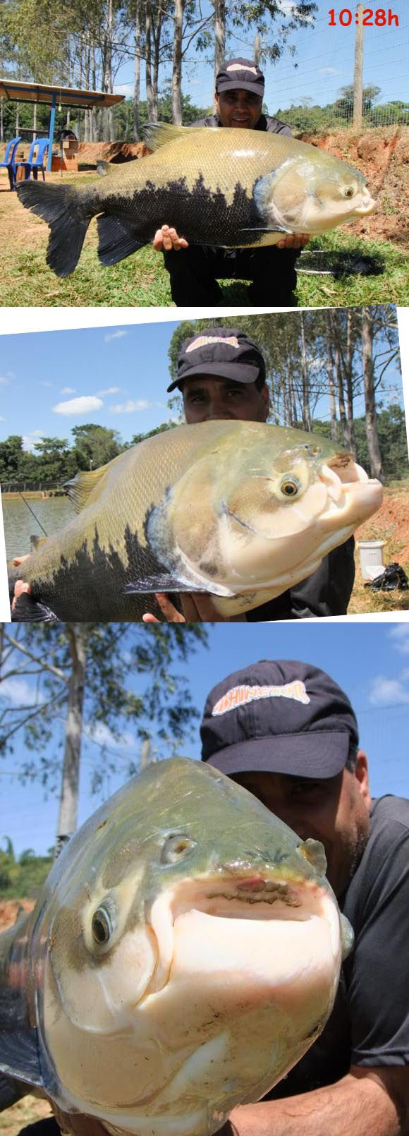 Continuamos insistindo na superfície, sem muito sucesso e decidi montar outro equipamento de fundo com uma pequena tilápia e minutos depois, quando estávamos nos protegendo do Sol embaixo do quiosque observo a vara quase “bebendo água” e corro para confirmar a fisgada de um peixe que “pesou” e acreditávamos ser uma Pirarara, mas após o primeiro rebojo na margem identificamos ser um legitimo Tambaqui (verdão) que brigou demais, mas não resistiu, e esse belo peixe pousou para sessão de fotos com o Fishingtur. Observem a boca do “menino”!!!