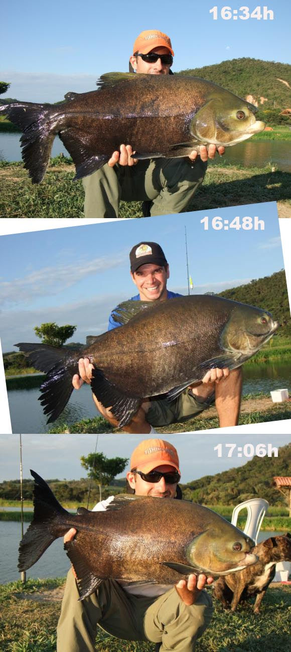No finalzinho da tarde, eu e o Saulo recebemos a visita no lago de dois funcionários do pesqueiro, estes que hoje são grandes amigos. E como ambos estavam com as camisetas do Fishingtur-Pousada 4 Estações, os coloquei prá pescar. E não é que A Franciele pegou um grande Tambacu e depois ainda saíram mais dois exemplares, dois com o Willian e outro com a Fran.