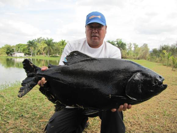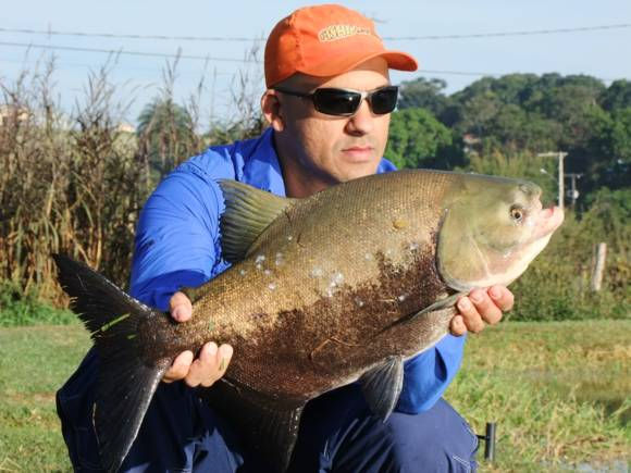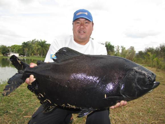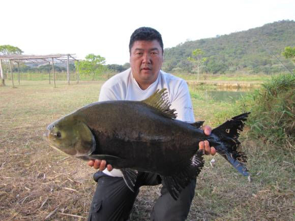 O China fisgou um bonito Tambacu mais uma vez na Ração Labina, um exemplar bem escuro, o legítimo Tambacu Negro. Até brincamos, pois parecia que o China tinha mergulhado o peixe no petróleo de tão negro que era.