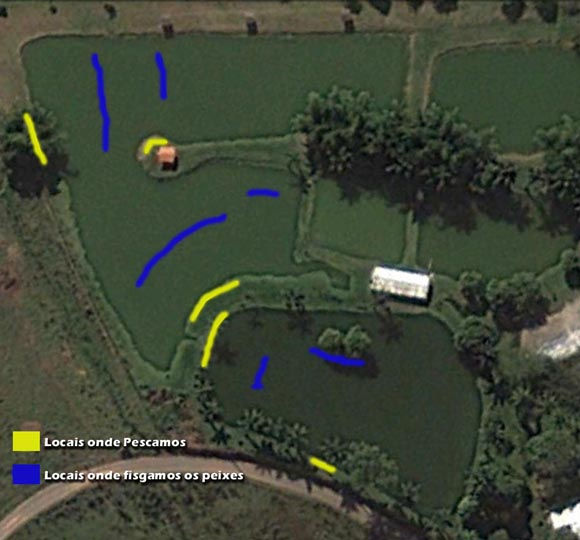 Como dissemos, os dois lagos aqui da Pousada Quatro Estações tem inúmeros pontos de pesca, abaixo vou demonstrar todos os lugares em que ficamos e os pontos onde fisgamos mais peixes.