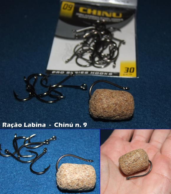 A isca mais usada nesta pescaria foi a Ração Labina, que é usada e vendida no próprio pesqueiro. Pegamos muitos peixes nas miçangas e eva’s, mas a grande maioria foi na Ração Labina. Usamos esta ração nos chicotinhos com anzol chinú n. 9 ou no anzol wide gap (robalo). A ração afunda ficando na profundidade desejada, tanto na bóia torpedo ou na bóia cevadeira das Bóias Barão.