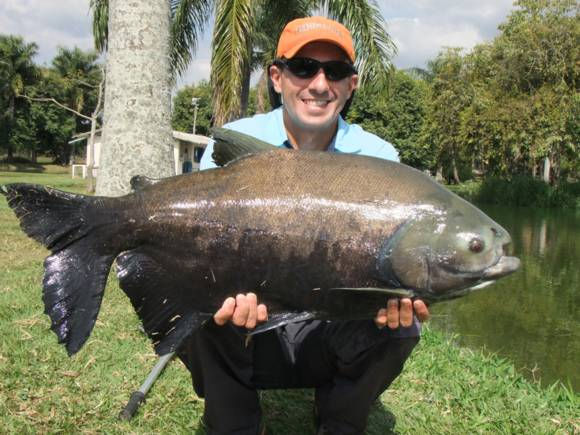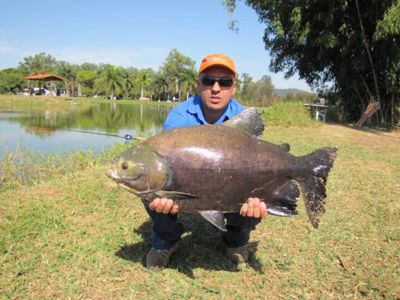 Logo após o almoço, deixei uma cabeça de tilápia armada no fundo, bem próximo a ilha e depois de várias beliscadas, acabei fisgando um valente tambacu. Eu estava com um anzol 5/0, chicotinho de 20cm de linha mono 0,45mm, girador, chumbada solta na linha, tudo isso em um equipamento médio leve, com vara de 10-20 libras.