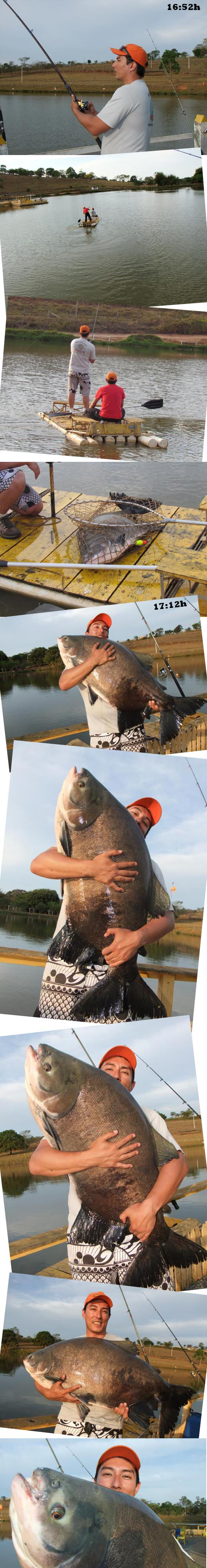 Logo depois, uma bóia torpedo com poita que o Felipe tinha arremessado no meio do lago com chicote de 30cm com tripa de galinha afundou. Ele fisgou e vimos o peixe literalmente sumir com mais de 50 metros de linha, o peixe foi para o meio do lago e depois nadou para o outro lado, passando por trás do deck, por sorte o Léo estava no deck e levantou a linha, e enquanto isso eu e o Felipe pulamos para a jangada e eu no remo fui até o peixe, passamos pelo deck, o Léo soltou a linha e conseguimos levar o peixe para o meio do lago, e mesmo depois de tudo isso o gigante Tambacu ainda teve força para brigar um bom tempo.