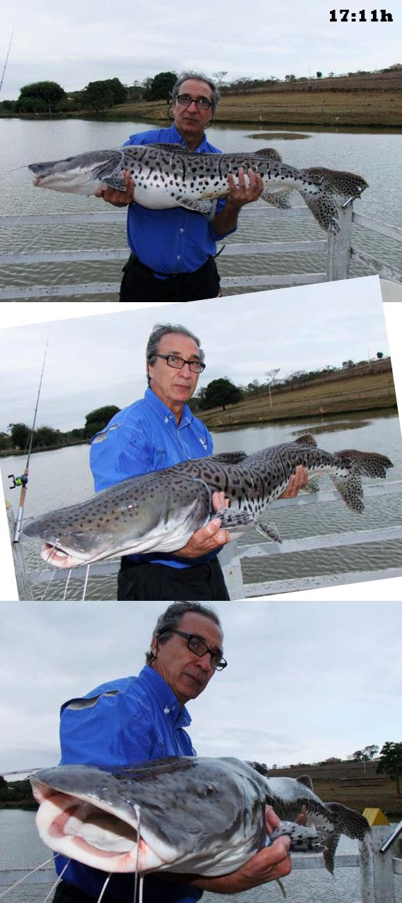 Arremessei uma cabeça de tilápia bem no meio do lago, coloquei a vara no suporte e estávamos conversando quando assustamos com a velocidade que a fricção girava soltando linha do carretel. Corri, tirei a vara do suporte e o bicho tomava cada vez mais linha, tinha certeza que era um peixe bom, até que ele correu direto para a margem, denunciando ser um peixe de couro e dos bons. Mais de 10 minuto de briga e o gigante encostou dando muito trabalho para o Felipe o pegar com o passaguá.