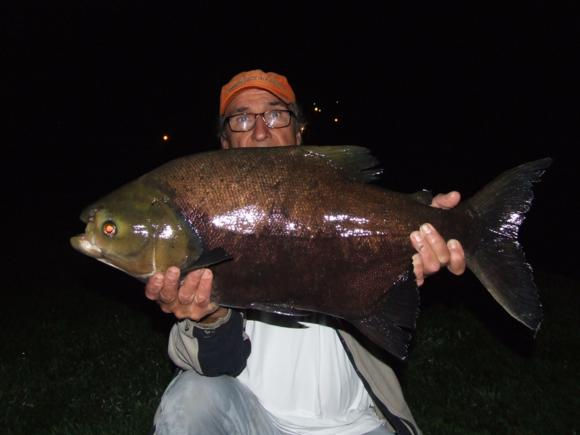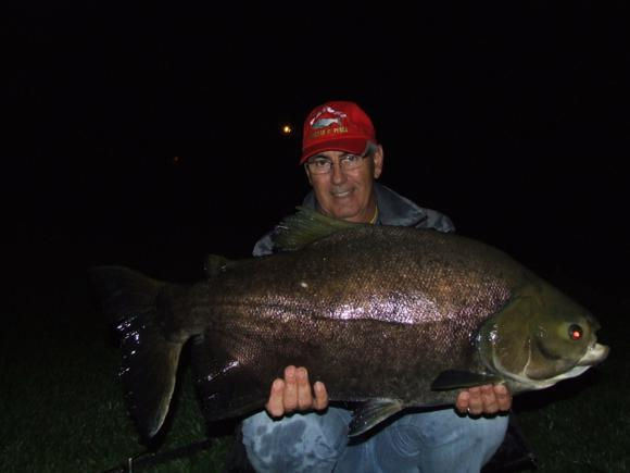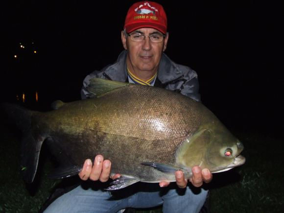 Havíamos levado um saco de ração e apesar do escuro executei uma boa ceva e os redondos começaram a subir e logo engatei um peixe de bom tamanho que “brigou” demais e tomou muita linha, mas adentrou no capim na margem oposta e acabou escapando. Todavia, com o amigo Adimir a conversa foi outra e o peixe sem pestanejar veio para o click de nossa câmera.