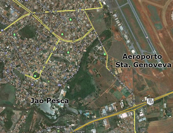 A foto abaixo mostra bem a proximidade do Jaó Pesca com os Aeroporto Santa Genoveva, dentro da capital Goiânia.