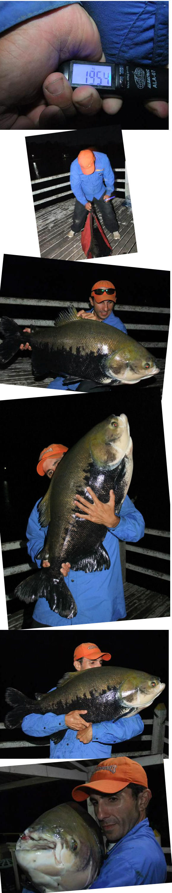 No final da tarde, estávamos pescando com a bóia cevadeira com chicote de 40cm de linha mono 0,50mm e um anzol chinú n.9. A isca era uma ração Labina. Fisgamos dois pequenos tambas, quando minha bóia sumiu e eu fisguei, automaticamente levei um contra-ataque com uma tomada de linha muito grande e forte. Era certeza de ter um gigante nas mãos, mas a briga não parava, com corridas fortes e já estava quase escuro quando comentei com o China: