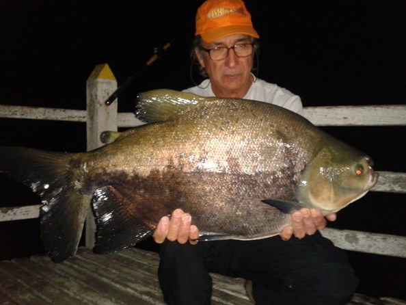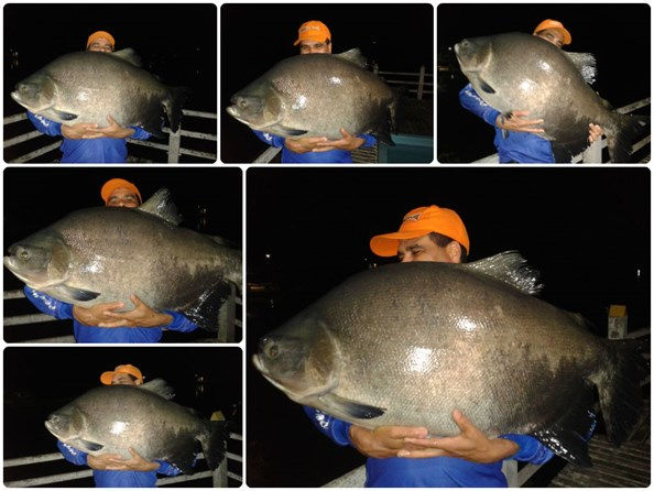 Como a isca de salsicha estava fazendo a diferença, no inicio da noite o Junior comenta comigo…… Silvião coloca uma Salsicha de isca bem rente à margem mantendo a vara apoitada. Eu fiz exatamente isso, mas em um píer bem longe do local onde estávamos e ficamos batendo um bom papo e 30 minutos depois fui conferir e o carretel estava com no maximo 3 voltas de linha, ou seja, o peixe tinha levado facilmente (fricção não muito apertada) 100 metros de linha e apenas recolhi um pouco do excesso de linha e dei uma confirmada na fisgada e o peixe pesou e para minha sorte veio apenas acompanhando o recolhimento da linha disparando com algumas corridas apenas quando já muito próximo da margem e mesmo muito apreensivo (desconfiava do tamanho da criança) consegui com a ajuda dos amigos colocar o redondão nos braços. Vejam que beleza de exemplar… esse é dos brutos, esse é REX!!!