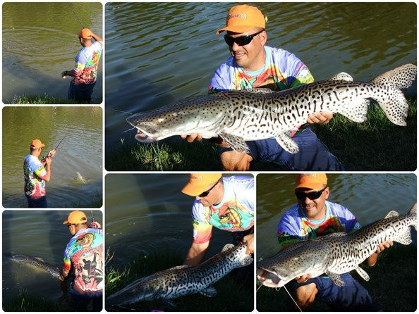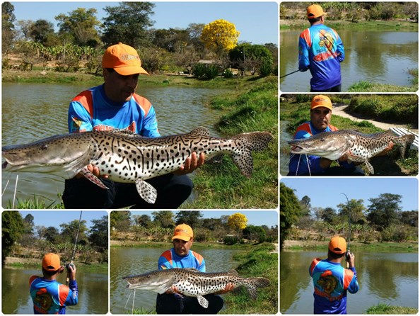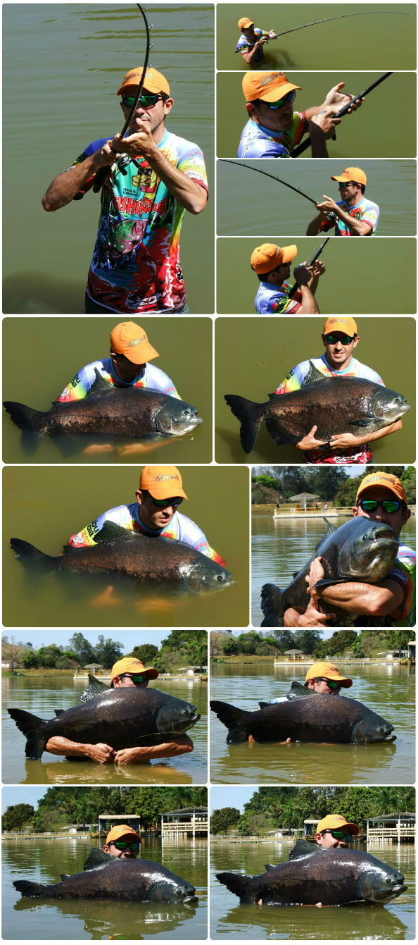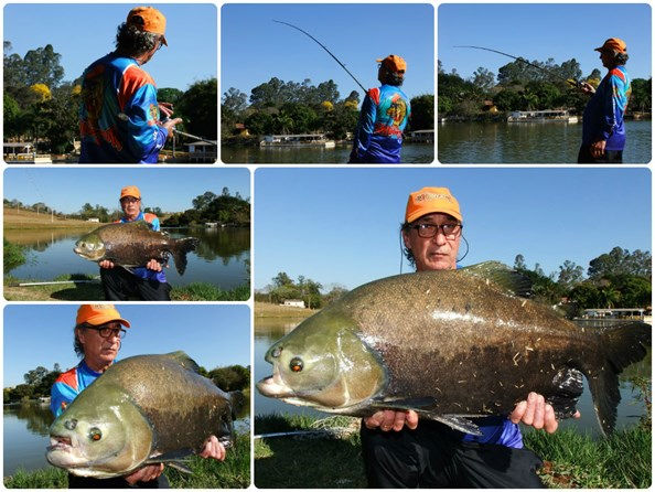 A pescaria com o pão flutuando que sempre é muito produtiva com os grandes exemplares na Fazenda Paraná não estava surtindo o efeito esperado, mas com a isca de salsicha flutuando os peixes estavam atacando bem. Eu e o Marcio estávamos pescando na margem oposta ao restaurante e utilizando essa isca e de repente escutamos uma explosão daquelas (POWWW!!!) com o peixe tomando linha desesperadamente e quando faltavam apenas uma volta para zerar o carretel o Marcio conseguiu “quebrar” a corrida do peixe e recolher alguns metros….. A partir daí é que a “briga” começou de verdade e acreditem o peixe mesmo com o Marcio dentro da água demorou mais de 30 minutos para se entregar. Não era dos Gigantes, mas era um bom e valente exemplar!!!