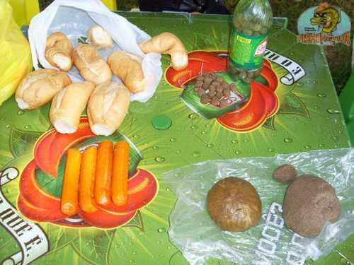 Para esta pescaria levamos algumas iscas: salsicha, massinha caseira de farinha de trigo, pão amanhecido e ração para peixe molhada na pinga.