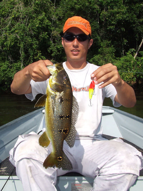 Para completar as reportagens de pesca na Pousada São Benedito, vamos mostrar a vocês como foi a nossa pescaria com iscas artificiais no Rio São Benedito. Na época em que estivemos na Pousada o rio estava bem cheio, o que é perfeito para os peixes de couro, porém dificulta e muito a pesca dos tucunas com as iscas artificiais. Mas mesmo assim não tivemos tantos obstáculos assim e conseguimos realizar uma boa pescaria. Foram Matrinxãs, Bicudas, Tucunas e Jacundás, todos com iscas artificiais. As iscas de superfície não tiveram muitos resultados, pois como o rio estava muito cheio, o peixe estava mais na meia-água. Todas as iscas usadas de meia-água e sub-superfície tiveram bons resultados, principalmente as iscas de sub-superfície da KingFisher. O nome da isca é FLASH.