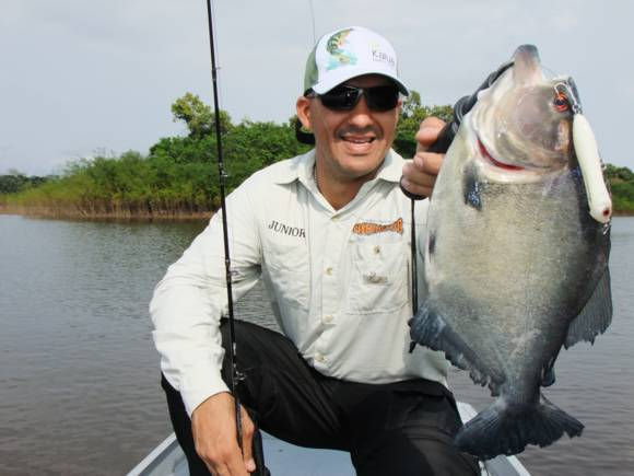 Mudando de ponto, agora em uma grande lagoa e com a água invadindo um pouco da mata, começamos a usar iscas barulhentas como as hélices da JennerLure e o Popper Titan da Zagaia. Aos poucos percebemos que os peixes estavam saindo do mato em direção a nossas iscas, mas sem atacá-las, foi aí que imediatamente troquei o Popper pela Dr. Spock e no primeiro arremesso com a Zara duas grandes rebojadas e a explosão fez minha varinha envergar, mas além da fricção travada, o dedo ainda segurava o carretel, garantindo que o peixe não fosse para a pauleira. Uma briga forte e com um grande salto bem ao lado do barco fez o coração bater mais forte ao ver o brilho e o colorido deste belo Tucunaré Açú.