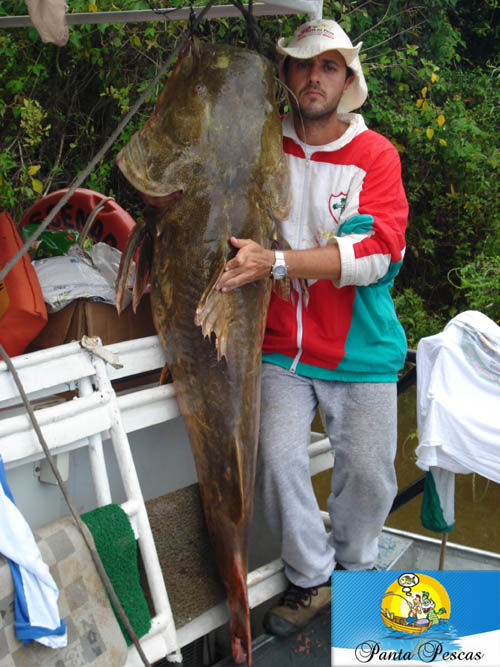 Depois de já ter fisgado mais de 5 jaús no mesmo dia, o Marcelo da Pantapescas travou uma briga de mais de 1h:40min, usando vara de 25lbs e linha 0,50mm, um anzol 12/0 com minhocoçus de isca. Depois desse tempo todo o gigante subiu algumas vezes rebojando e indo pro fundo de novo. Uma briga fantástica, capaz de deixar qualquer pescar louco. Quando o peixe encostou no barco a alegria era imensa, mas a preocupação também era grande. O peixe jorrava sangue pelas guelras e só depois de embarcado que deu para ver o que tinha acontecido. O peixe embuchou a isca, ou seja engoliu o anzol 12/0 e com esse tempo todo de briga, o seu estômago, buchada foi rasgada, dilacerada, e se este peixe fosse solto, as piranhas iriam acabar com ele em minutos, mediante o ocorrido o Marcelo juntamente com os piloteiros resolveram embarcar o peixe. Foi uma fatalidade, mas é algo que pode acontecer com qualquer um. O Marcelo doou o peixe aos piloteiros. Segue a foto do Gigante.