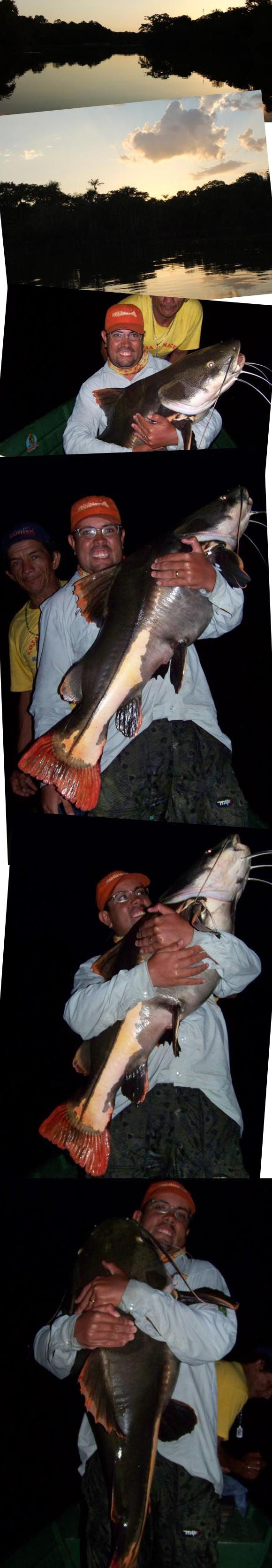 Em todo final de tarde, era comum pararmos os barcos todos juntos para beber uma cerveja e bater um papo, contar as mentiras. E os viciados de plantão já arremessavam as iscas e varas pesadas para os peixes de couro. Nesta tarde, o Rogério estava apenas com o equipamento de tucuna, com vara de 25libras e carretilha de perfil baixo com muito de 65 libras. Abusou da sorte e arremessou uma posta de traíra, e não é que rapidamente a varinha envergou e vimos toda a sua linha indo embora. A sorte foi que o guia ligou o motor e conseguir ir atrás do peixe, era uma briga pesada em um equipamento leve. O peixe enroscou duas vezes nas galhadas, mas acabou saindo. Depois de mais de 25 minutos de briga vimos a gigantesca Pirarara boiar. Era a do “Rabo Vermelho” marcando presença e de uma forma inusitada. Podemos dizer que foi sorte sim, pois em uma tralha leve em um rio cheio de galhadas, pegar um peixe deste tamanho, não é pra qualquer um não. Isso é Fishingtur !!!!!