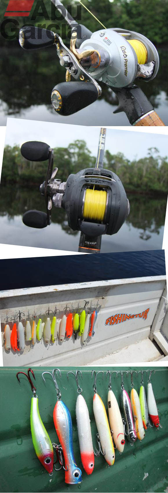 Abaixo, parte dos equipamentos que foram utilizados por nossa equipe e observem que até mesmo os Barcos foram personalizados com a marca Fishingtur em plena floresta amazônica. Demais!!!! Um destaque especial a um dos equipamentos de nosso amigo Marcio David, o qual utilizou a ótima Carretilha Revo Premier da Abu e conjunto com a Vara customizada de nosso grande parceilo Leal Custon Rods