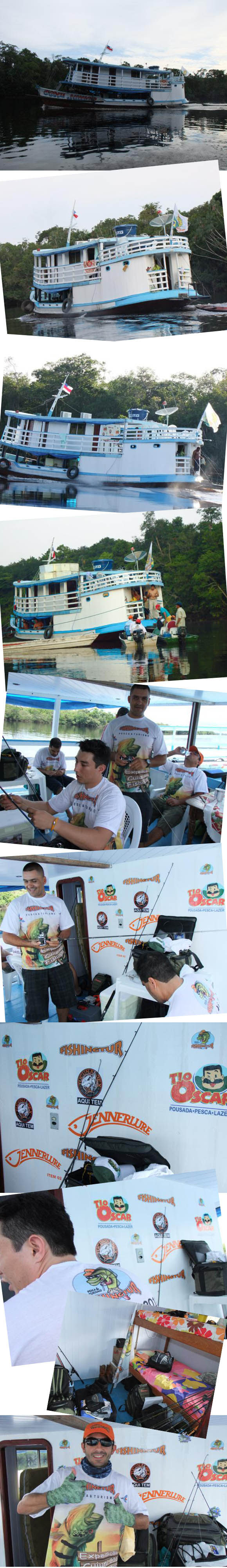 Partimos do porto de Barcelos por volta das 09h:00min e abaixo algumas fotos do possante Barco Comandante Junior de propriedade de nosso amigo Sara já navegando pelas águas do Rio Negro e também nossa equipe montando e preparando os equipamentos para a grande “batalha”. Este início de “pescaria” em minha opinião é um dos melhores momentos, superado apenas quando temos um dos gigantes TucunossauroRex na ponta da linha.