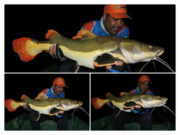 Equipamentos pesados na água sendo varas de 80 libras e Carretilhas da Abu Garcia e as Penn dos amigos da Penn Raíba Carretilhas ambas comportando 120 metros de linha 0.92 mm. Pescaria iniciada, equipamento na mão, uma boa conversa com os amigos, noite caindo pra valer quando de repente o equipamento que eu estava utilizando começa a baixar lentamente e não tive duvidas fui acompanhando até a ponta da vara chegar bem perto da água e fisgada nele, ou melhor nela e o contra-ataque foi imediato e em um trabalho de equipe, Dino solta rapidamente o Barco e liga o motor e nesse momento o melhor é travar a linha com o dedo e tentar “rebocar” o peixe para termos uma briga mais limpa no meio do Rio. Depois de umas 3 longas corridas quem estava em nossos braços???? Ela mesmo a Pirarara capturada em seu habitat… Show e digno de nota 10!!!