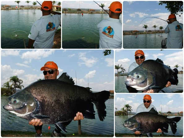 Decidi então tentar fisgar um Pirarucu, afinal tinham dezenas deles passeando pelo lago. Montei a Vara Veritas da Abu Garcia com a Carretilha Revo STX, com linha mono 0,36mm, fiz um líder de 0,50mm, e um anzol worm (blackbass). Com uma salsicha inteira flutuando, fui andando pelo lago e ao avistar os Pirarucus, arremessei dois metros a frente, ele foi se aproximando e sugou a salsicha. Fisgada no queixo dele e uma briga fora do comum no equipamento leve para este peixe. Minutos de vai e vem até que bem próximo da margem ele colocou mais da metade do corpo fora da água, tentando se livrar do anzol. Um show de imagens até que a equipe do pesqueiro conseguiu retira-lo da água com o grande passaguá. Uma sessão de fotos e peixe na água com segurança.