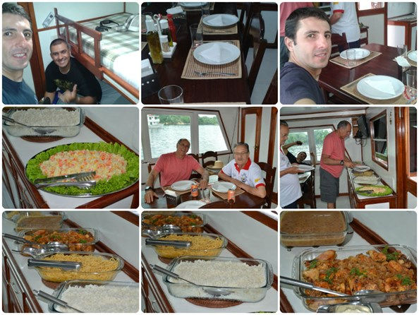 Por volta das 9h já estávamos embarcados. Eu e o Júnior seguimos para nossa cabine onde arrumamos nossas roupas e aproveitamos para tomar um banho e dormir um pouco, afinal nossa noite no aeroporto tinha sido longa. Acordamos na hora do almoço e fomos surpreendidos por uma comidinha caseira e muito saborosa. Fizemos uma boa refeição em companhia de dois amigos pescadores do grupo, o Cirilo e o Natal.