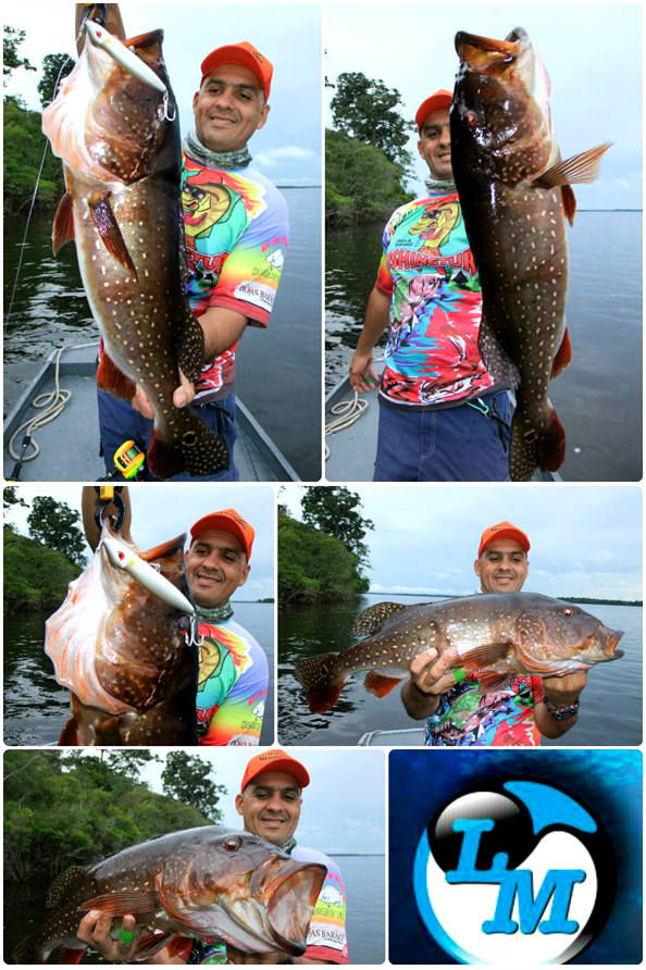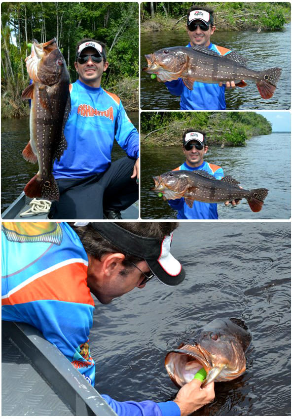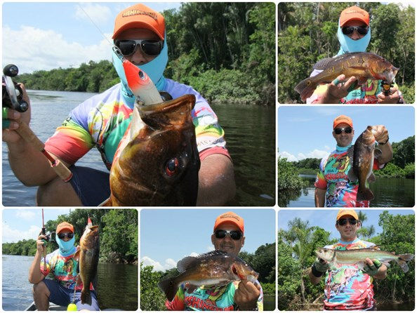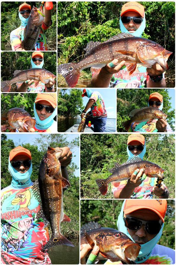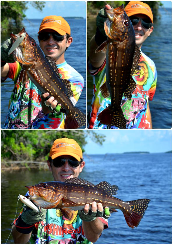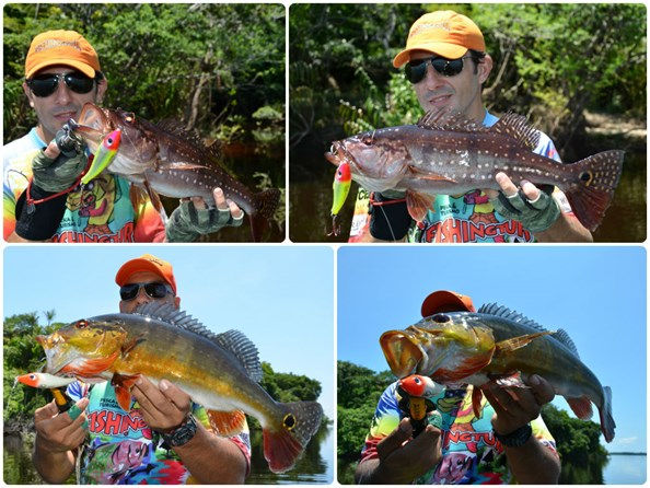 Peixe manhoso na superfície, era hora de colocar a Prima Gold para trabalhar e era fatal. Como o Júnior estava a todo momento com as zaras fazendo barulho na superfície, eu vinha na sequencia com a Prima Gold um pouco mais embaixo e fisgando os pacas, borboletas e outras espécies de menor tamanho.
