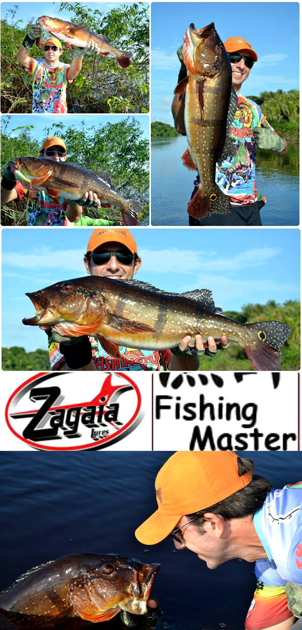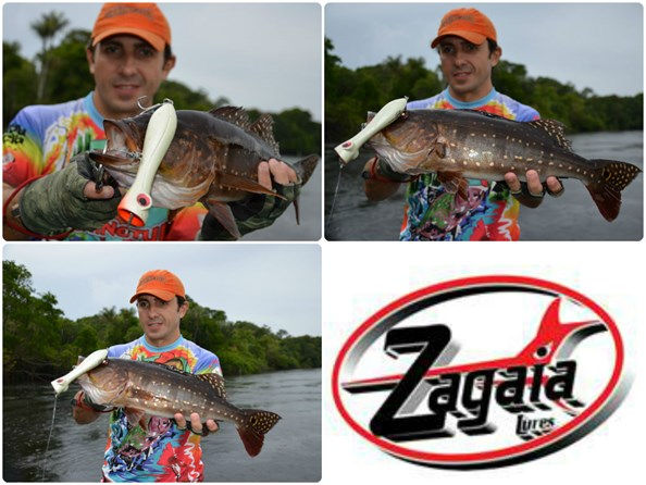 Eu sempre gostei de pescar tucunarés com as hélices, poppers, zaras, meia-água entre outras. Eu nunca tinha me dedicado a usar as “João-Pepino”. Mas peguei em minha caixa a isca Zé Pepino 22g da Zagaia Lures. Confesso que o trabalho dessa isca é chatinho, mas é só no começo, depois você pega o ritmo e o trabalho da isca vem naturalmente. E na insistência fisguei um bonito Paca que não resistiu ao trabalho errático da isca.