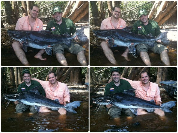 Enquanto estávamos almoçando no barco, nossos amigos Bola e Léo decidiram comer um tucunaré assado na beira do rio. Enquanto estavam descansando na rede e o guia montando a “churrasqueira”, a vara de peixes de couro ficou armada e foi só o guia ascender o fogo que o alarme disparou, pularam pro barco e desceram o rio atrás do peixe. Uma briga das boas e para a surpresa de todos era uma bonita Piraíba que mediu 1,60 mts. Voltaram para o lugar do churrasco, mediram o peixe, tiraram fotos e soltaram. Felizes da vida, arremessaram novamente e 15 minutos depois, bastou ascender o fogo que o alarme disparou novamente, e outra vez saíram em disparada e depois de outra briga pesada, trouxeram outra Piraíba, esta medido 1,43 mts. Depois disso, não arremessaram a isca novamente e decidiram então almoçar tranquilamente. Segue a foto das duas Piraíbas.