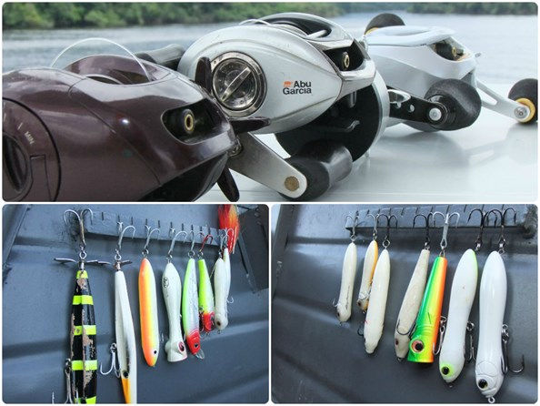 Além de deixar as melhores iscas no apoiador do barco, como já disse, sempre deixo três equipamentos montados e com iscas. Um equipamento com a Hélice ou Popper, o outro com a zara e o terceiro com o jig. Faço isso pois, se o peixe rebojar na hélice, arremesso na sequencia a zara com trabalhos mais lentos. Se o companheiro de pesca pegar um peixe, arremesso o jig na sequencia, e assim consigo rapidamente aproveitar ao máximo as oportunidades.