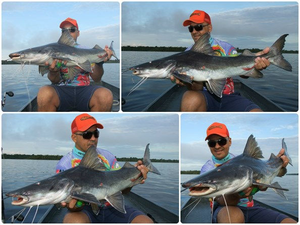 Todo final de tarde parávamos para fechar o dia com os peixes de couro. Minha vara envergou três vezes, em uma delas uma longa tomada de linha, mas bastava eu tirar a vara do suporte para o peixe soltar. O Júnior, usando a Carretilha Big Game 10.000 da Abu Garcia fisgou mais uma valente e rápida Piraíba