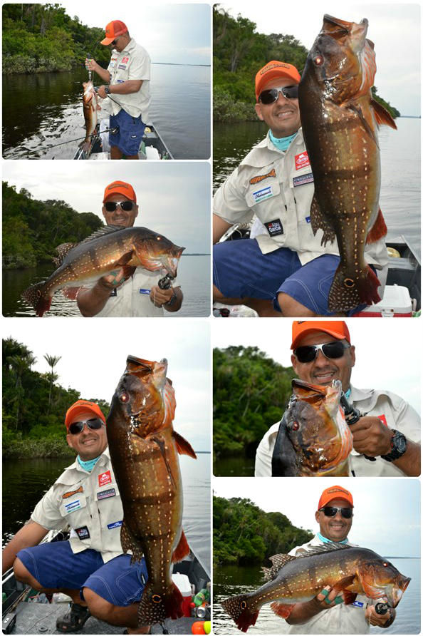 Nosso guia prontamente gritou para soltar a linha e não travar. Pediu prá deixar o peixe correr. Depois disso encostou o barco e com o remo foi puxando a linha por baixo de galhos, puxa daqui, dalí, até que ele pulou na água e vou prá dentro do mato. Nos pediu o alicate e minutos depois voltou com o grande Tucunaré nas mãos. Um gigante para nos alegrar nesta tarde chuvosa. Mais de 90% deste peixe devemos ao Orlando, pela agilidade, paciência e conhecimento.