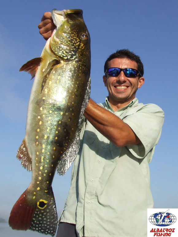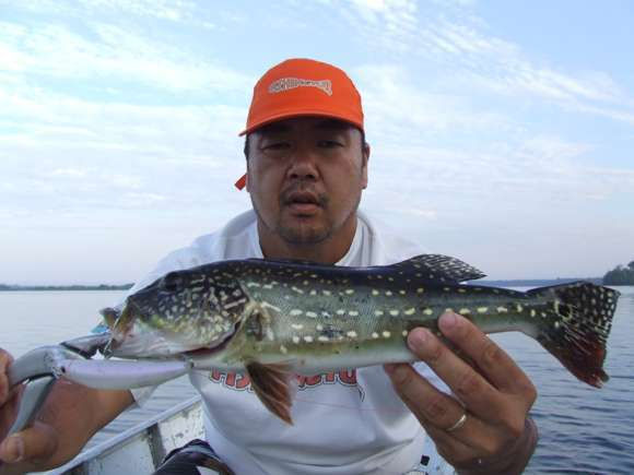 Com uma grande isca de meia-água da Marine Sports, de cor verde e preta o China engatou um gordo Tucunaré Paca e na sequencia engatou um outro belo exemplar que tomou muita linha e acabou estourando o multifilamento 50 libras levando a isca embora.