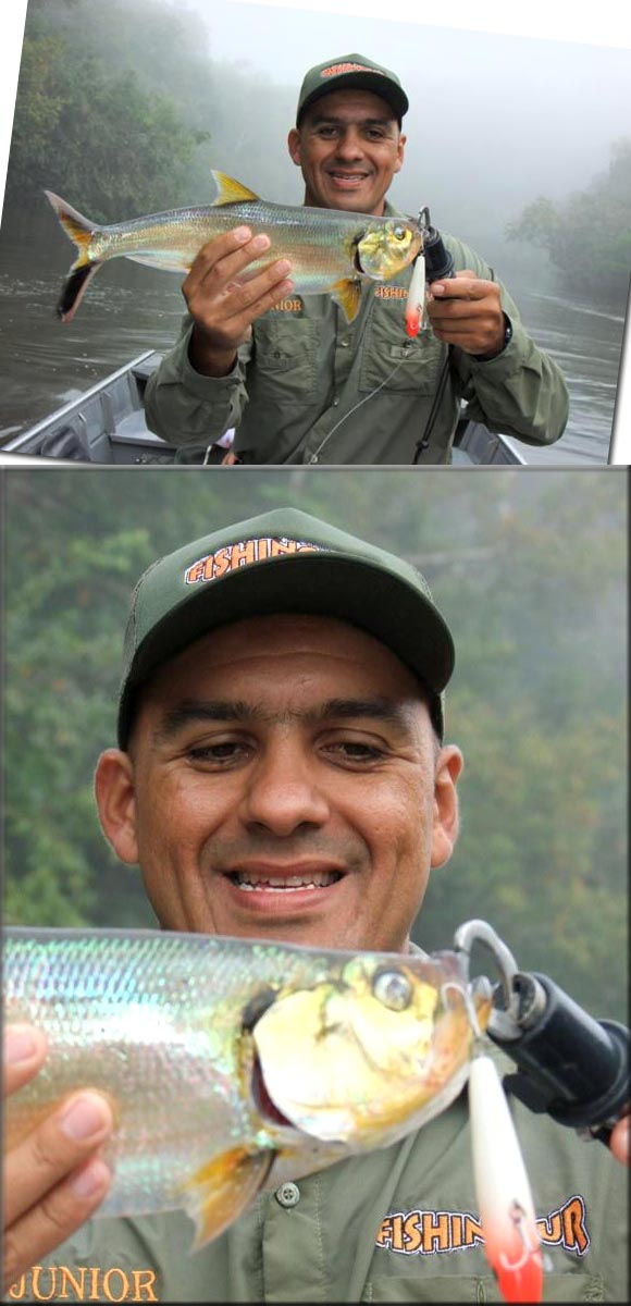 Passamos com o barco lentamente em frente a este barranco e no primeiro arremesso, assim que a isca do júnior caiu na água, uma pequena explosão, ele trabalhou a isca e outro rebojo e um pouco antes de chegar no barco um bonito Apapá atacou a isca.