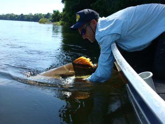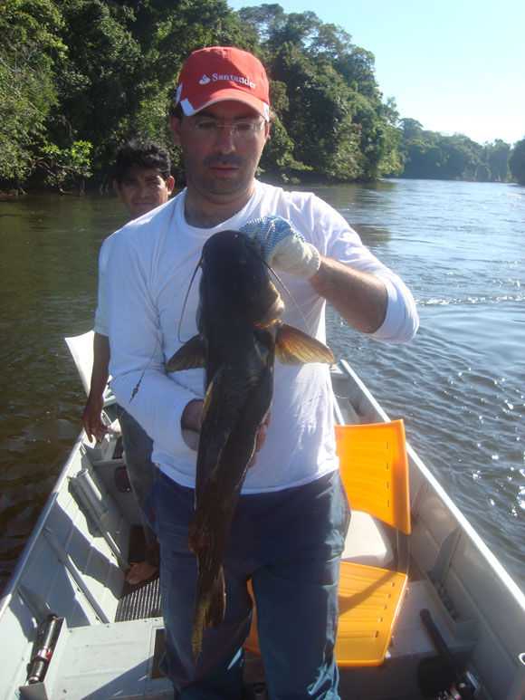 Um peixe que estava bem ativo era o Jacundá, perdemos as contas de quantos exemplares nós fisgamos com as artificiais. O Leandro, nosso guia, ora arriscava as artificiais, ora com as tuviras, engatou alguns tucunas, jacundás e pequenas traíras. Do outro lado do rio, nosso amigo Bruno Cia e o seu Poraquê, peixe elétrico. Os tucunarés estavam manhosos, não estavam atacando a superfície, apenas na meia-água e o Leandro, se aproveitando disso engatou mais um exemplar. Outro grande amigo do interior de São Paulo, Bruno Bonin, usando uma vara de ação média e como isca o minhocoçu, brigou bastante com a primeira “rabo vermelho” da viagem, uma bonita pirarara.