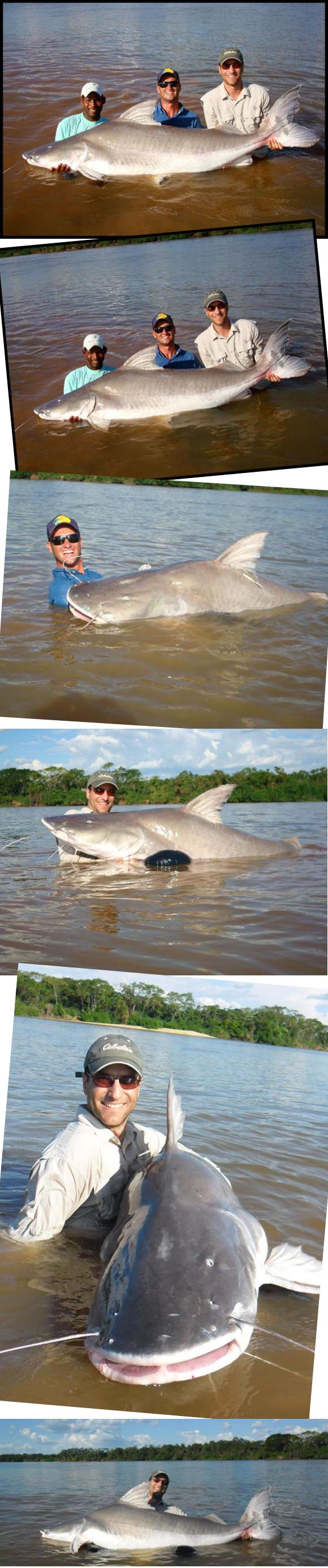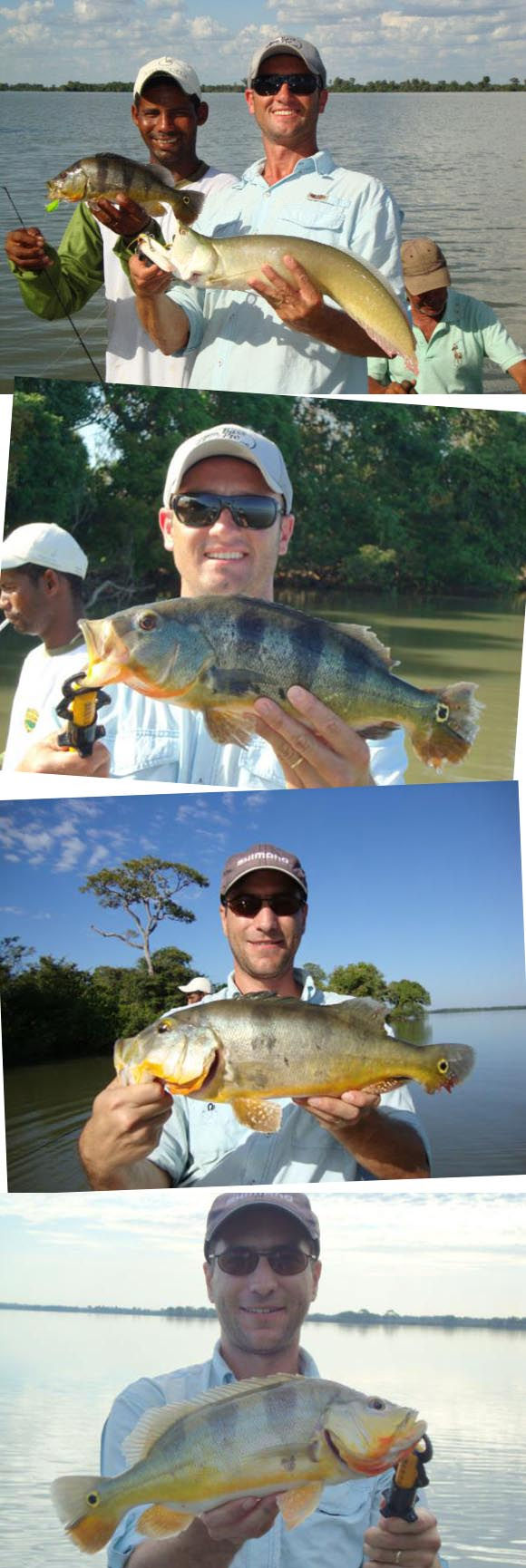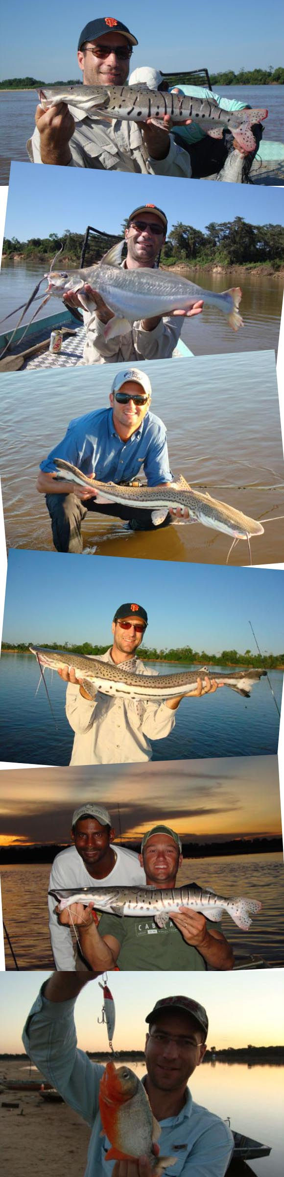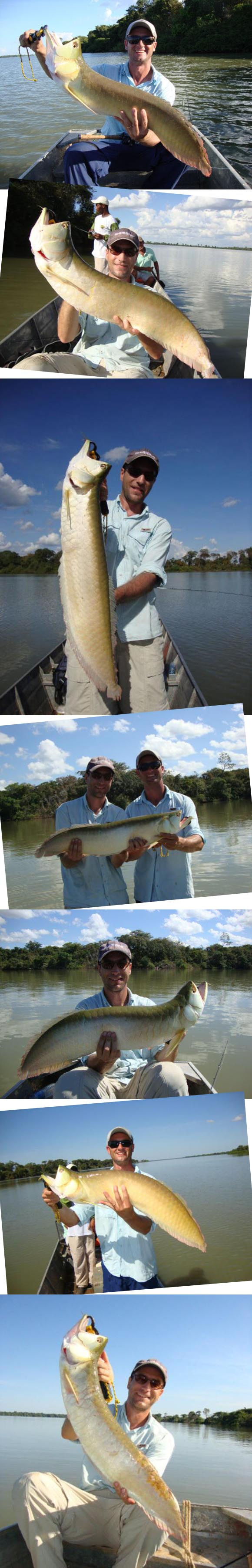 Trabalhamos somente com iscas artificiais de superfície e tivemos muitas, mas muitas ações de Piranhas, Tucunarés e lindas Aruanãs, quase incontável a quantidade que pegamos, exemplares de 3 a 4,5 kg com mais de 1 metro de comprimento, “dubles” e tudo que tínhamos direito. Todos os peixes foram soltos e dois exemplares de tucunarés fizeram o nosso almoço no lago. O quarto dia de pesca chegou, o barco estava “leve”, estávamos todos bem, e o Nica estava mais que doido para pegarmos nossa Piraíba, pegamos as iscas e passamos a manhã trabalhando e nada, almoçamos na pousada e o Nica saiu com Adilson para pegar mais iscas, eles achavam que deveríamos variar mais os tipos de peixes, chegaram com Traíra, Mandubé(Palmito), Jaraqui e Curimba. Voltamos para a água de novo, três varas e três iscas diferentes, paramos num ponto um pouco acima do Hotel Fazenda Primo Adão e lá aguardamos. Vinte minutos depois a melhor imagem do dia, uma vara envergada e uma corrida de peixe mais do que veloz, fricção trabalhando e carretilha saindo fumaça……..é ela!!!!