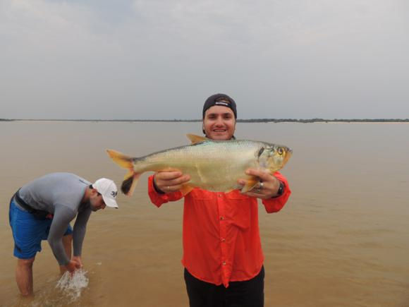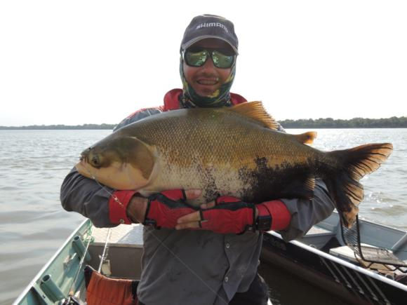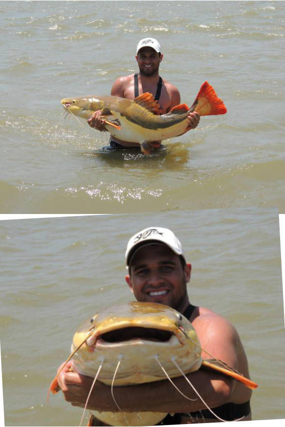 Gostaria de ressaltar que não só pescamos os grandes peixes, a diversão ficava por conta das explosões nas iscas de superfície das Douradas, Cachorras, Bicudas, e na pesca de fundo dos Mandubés, Corvinas, Barbados, Candirus, peixes estes que serviriam de iscas e para nosso almoço na beira do rio. Antes de fazer esta viagem , acabei achando um vídeo de pescaria de Tambaqui amazônico em pleno Araguaia. Confesso que fiquei meio desconfiado, nunca tinha ouvido falar em peixes do tamanho daqueles do vídeo, naquele rio. No último dia de pescaria, um índio da região comentou com a nossa equipe sobre a pesca de tambaqui nos lagos durante a cheia, com isso veio o vídeo na minha cabeça, grandes verdões que sou apaixonado rs ...