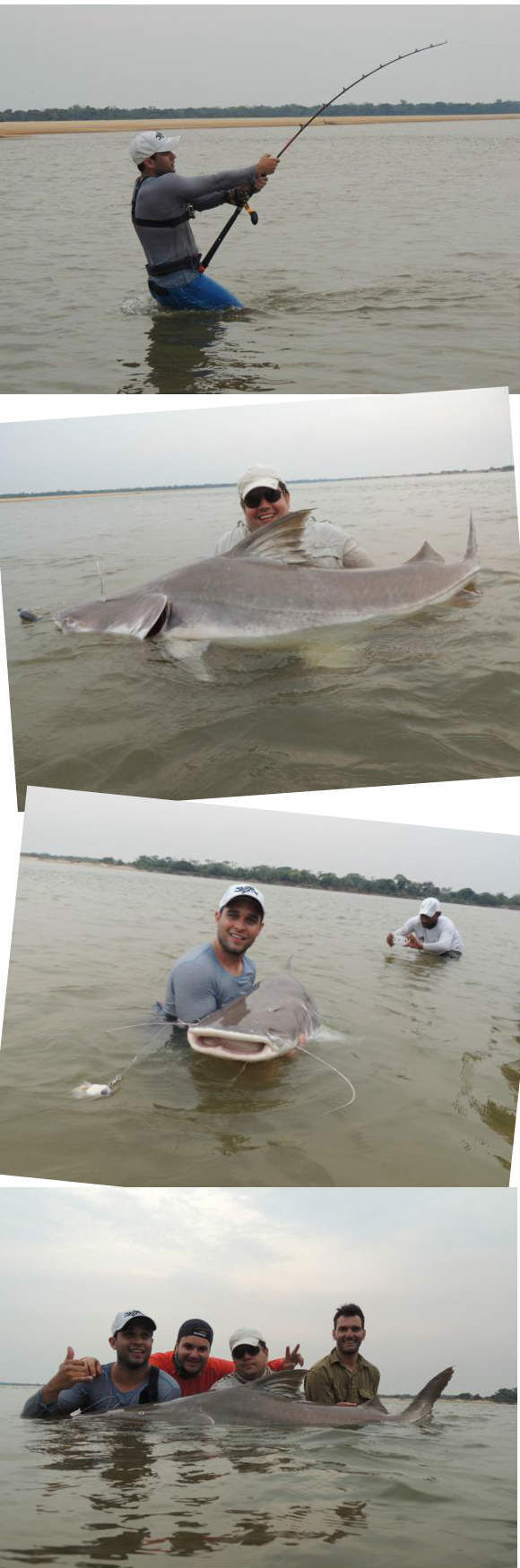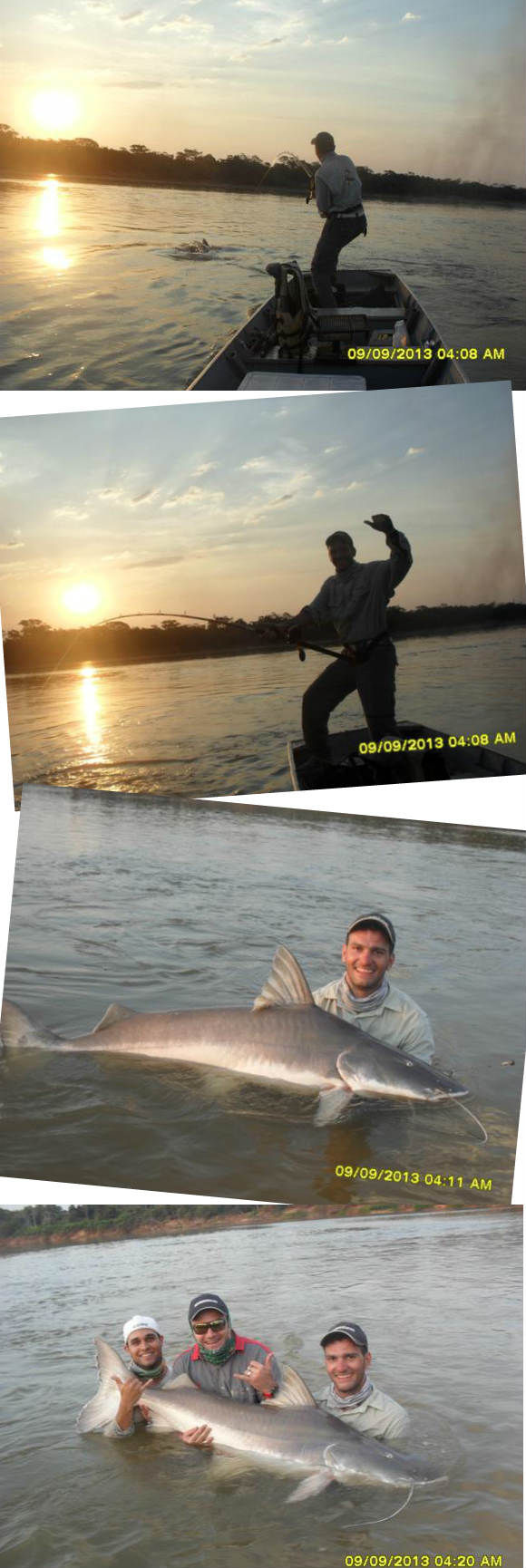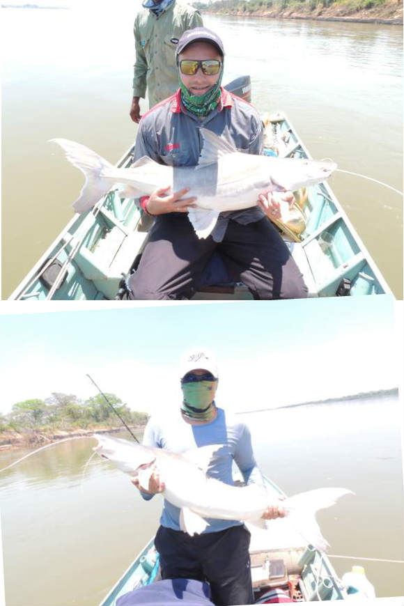 Confesso que fomos com a tralha pesada desta vez, mas assim como muitos, eu também achava que era história de pescador que o peixe puxava 100 metros de linha na 1 corrida, que estourava linha, empate, etc ... Sempre achei que era por falta de regulagem da carretilha, ou inexperiência do pescador rs. Mas depois desta viagem, mudei completamente minha opinião, ou se tem carretilhas com aproximadamente 300 metros de linha, ou torça para seu guia ser o mestre da pilotagem, e compensar a falta de material na água. Mas mesmo estando com guias experientes, tivemos 2 linhas 0,92 estouradas no 1 arranque do peixe, coisa inexplicável, linhas cortadas por piranhas, 1 empate de aço trançado de 200 lb estourado na briga, mas claro que isso não é regra, sempre sai peixe com tralha pequena, linha fina, etc ... vai da sorte e experiência de cada um, mas uma coisa posso afirmar, o sistema é bruto com os grandes !!!!