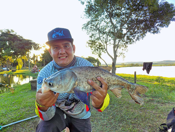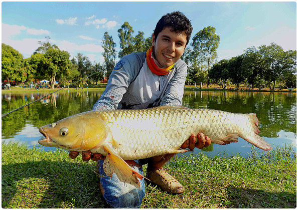 Peixe com a boca perfeita, mal ele solta o tambacu e já vê seu U.L envergando devagarzinho, ele até achou que era uma pirarara por ter tirado a isca do meio e deixado a cerca de 3 a 4 metros da margem, mas assim que fisga percebe que não é a dona pira mas sim, uma linda carpa capim que ao descer deu uma tomada de linha violenta.
