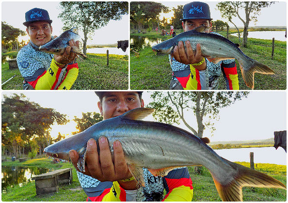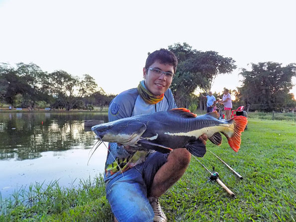 Mas as surpresas não paravam por ai, recebo uma corrida no U.L que quase tirou a vara do suporte em uma corrida muito rápida e forte, percebi que não era peixe grande mas não sabia dizer o que estava ali no anzol, até que ele chega na margem e o Rodrigo vira e fala "vai ser largo lá longe", você pegou um Pangasius, espécie que tem em pouquíssimos pesqueiros mas que fica muito grande, o dono diz que tem poucos mas nunca tinha pegado e tinha soltado a pouco tempo.