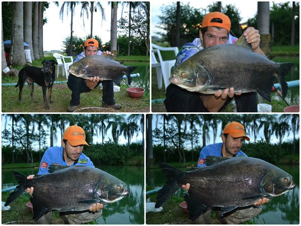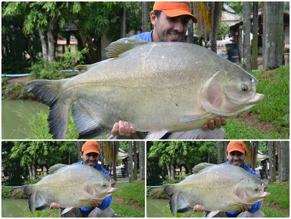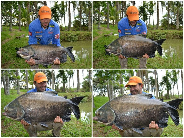 Decidimos então, tentar pegar um peixe no outro lago esportivo, jogamos ração e vimos muitos, mas muitos tambacus comendo em meio as tilápias. Assim que a ração acabou, arremessei 1/3 de um pão francês e não demorou nem 15 segundos e uma forte explosão fez minha linha esticar antes mesmo de fisgar.