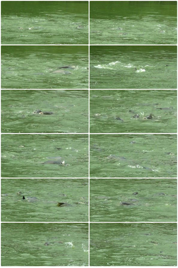 Jogamos mais um pouco de ração no aerador, mas os peixes não subiram tão rápido. Começaram a comer somente quando a ração chegou perto do mato. Arremessei um pedaço de pão flutuando e conseguimos fotografar novamente o momento exato do ataque.