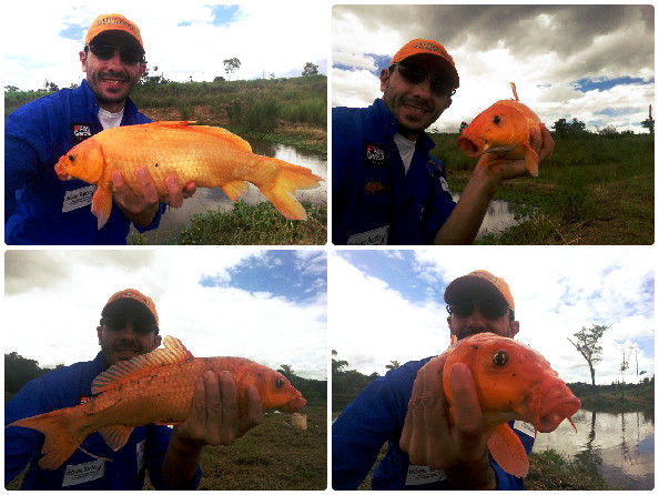 Fui rapidamente em um dos pequenos lagos, onde estão engordando algumas carpas, e com uma varinha de bambu com ração na pinga fisguei 4 belos exemplares.