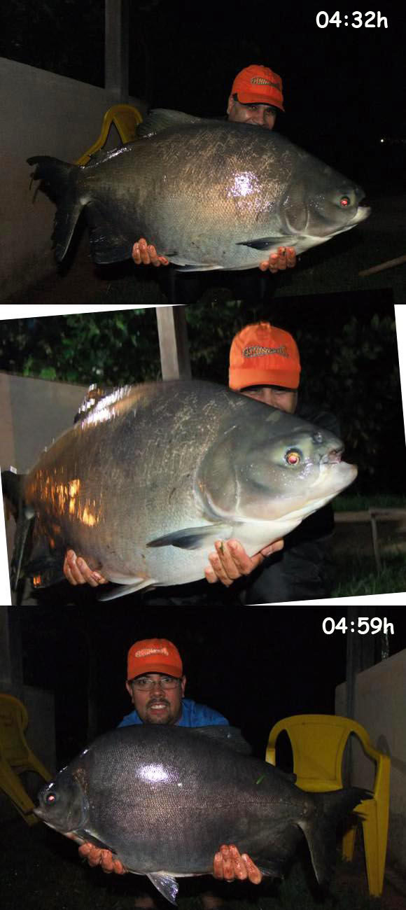 Mesmo com um bom número de Tambaquis capturados, os demais redondos (Tambacu e Patinga) não decepcionaram e abaixo 2 lindos peixes capturados pelo Silvio e pelo Rogério. O Rogério nos Eva’s e o Silvio na Salsicha boiando.