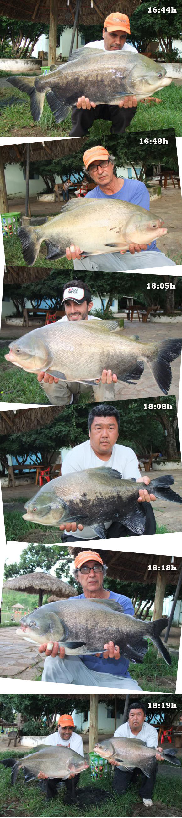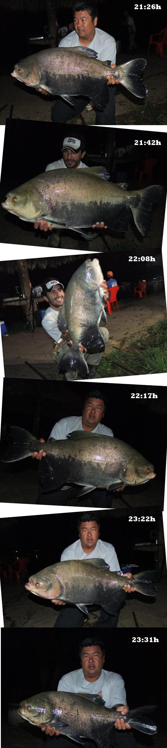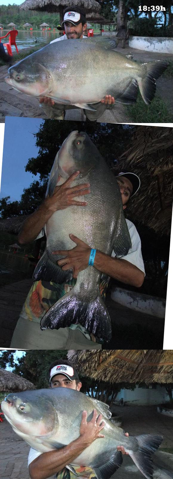 As iscas mais utilizadas por nossa equipe foram os eva’s e miçangas com anzol Wide Gap 2/0 (maior produtividade na cor café com leite) o “Beijinho” com anzol Pacu Pinnacle 5/0 e a ração úmida na pinga com anzol Chinú número 9. Para a salsicha boiando/flutuando utilizamos o anzol offset 2/0 (BlackBass) e para as Pirararas as iscas foram a guelra e cabeça de Tilápia com anzol direto na linha da MS 9/0 modelo 12146. No final da tarde insistindo na modalidade cevadeira o Marcio observa os eva’s se movimentando lentamente e quando desaparecem confirma a fisgada e o peixe segue de forma desenfreada para uma das margens do lago e sequer tomou conhecimento da fricção da carretilha. Todo o cuidado para não enroscar nos aeradores e nas linhas dos demais pescadores e, após uns 10 minutos um lindo exemplar de Tambacu parecendo uma prancha saiu da água para sessão de fotos. Peixe De Respeito!!!